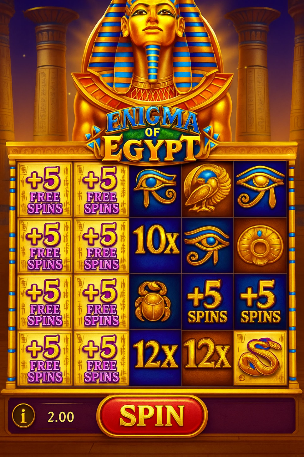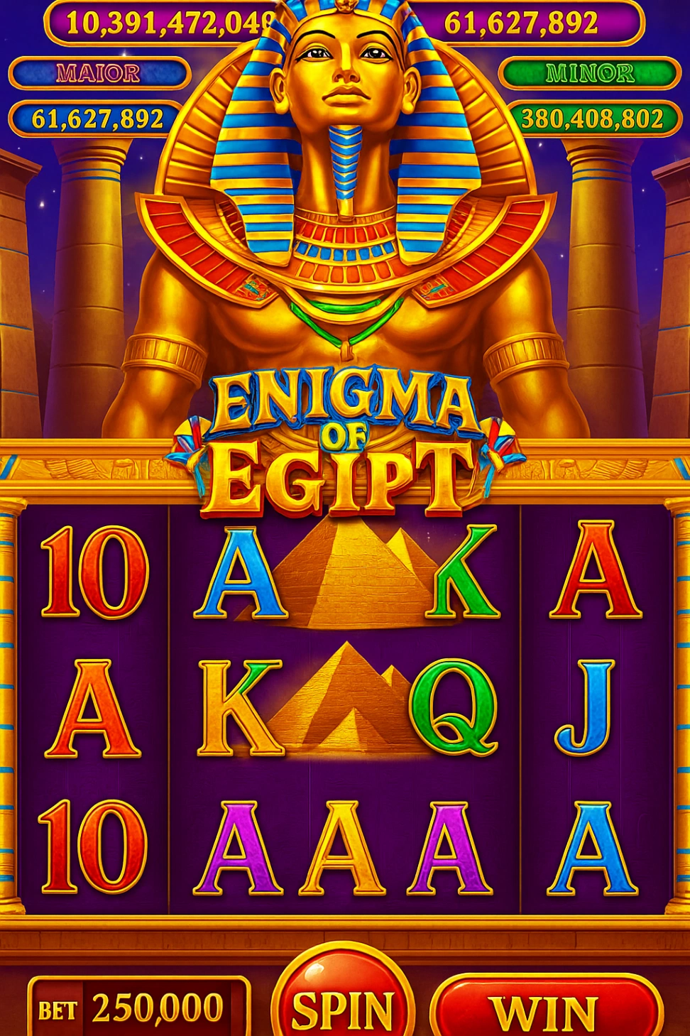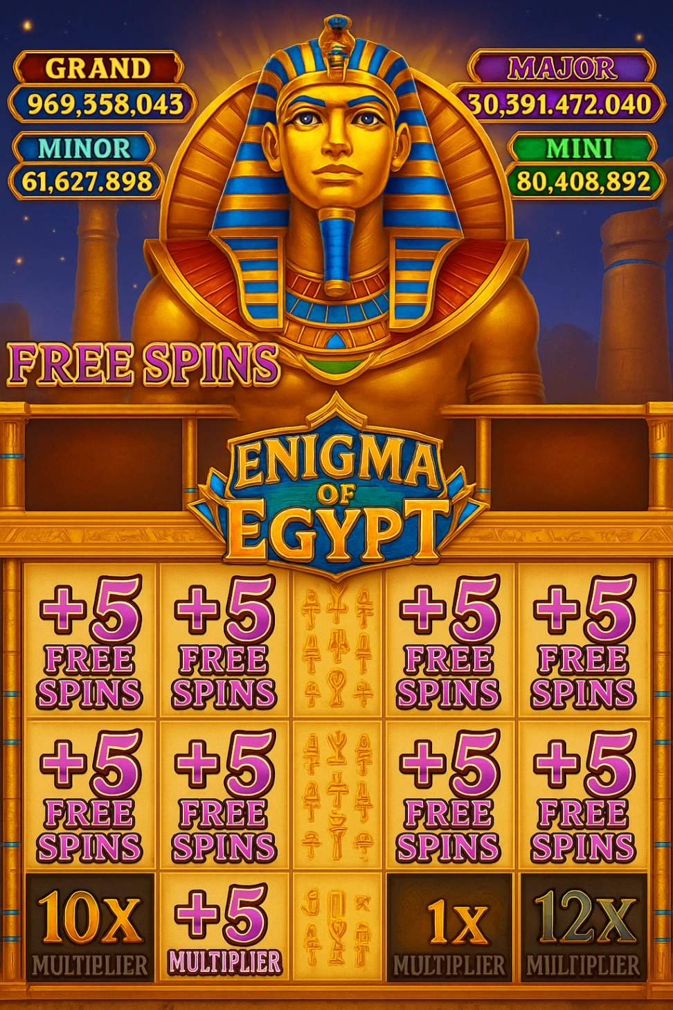 ¿Y qué sería de un viaje a Egipto sin algunos regalos? Prepárate para una lluvia de bonos y promociones que te dejarán sin aliento. 🎁 Desde bonos de bienvenida hasta giros gratis y recompensas diarias, ¡siempre hay algo extra esperando para potenciar tu experiencia de juego! Descarga Enigma de Egipto hoy y desvela los secretos que te llevarán a la fortuna. ✨